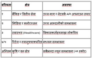 अनुसन्धानका अनुसार रिटेल, स्वास्थ्य र सार्वजनिक क्षेत्रमा उद्यमहरूको माग उच्च भए पनि बजारको अवसर भने केही कम देखिएको छ। यसको मुख्य कारण ती क्षेत्रहरूमा रहेको बजेटको सीमिततालाई मानिएको छ।